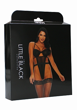 "Caught My Heart" two-piece lingerie set includes net underwire bra with choker collar, adjustable straps, hook an eye closure and matching net thong panty with attatched garter straps. This product comes in a box.
