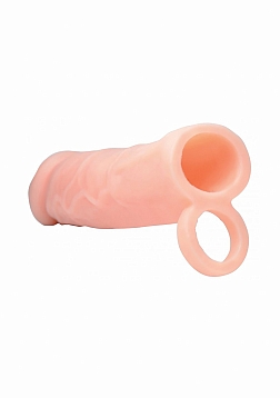 This premium silicone erection enhancer gives you at least 2 inches of added length, and plenty of girth! Realistically molded to look and feel like an actual penis! Just push your shact into the hollow extension sleeve and wrap the stretchy ring around your scrotum for extra security and added stimulation for your balls. Your partner will love experimenting with the bulging veins and bold head, not to mention the size of it! This material is non-porous and phthalate-free, but not compatible with silicone lubricants. Sanitize after use with mild soap or a toy cleaner.