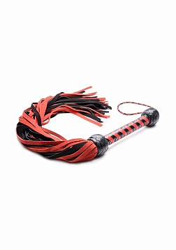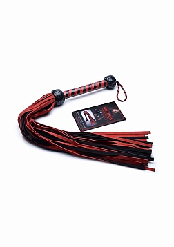 The many tails of this suede flogger will flash red and black as they impact the skin of your masochist. Each strand is supple and soft, but will land with a sting when used properly. The handle is leather tightly wrapped in an elegant black and red herringbone pattern, and features a matching leather wrist loop.