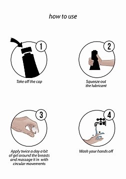 Directions for use: Apply twice a day a bit of gel around the breasts and massage it in with circular movements starting from the base of the breasts to the shoulder. Massage the gel until it is completely absorted into your skin. For external use only. Before using the gel on a regular basis, apple a small amount to your formearm. If a allergic reaction occurs, discontinue use. Keep out of reach of children. Store in a cool, dark place