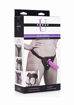 Embrace your femininity to the fullest as you assume the top position. This lovely corset harness features comfortable neoprene panels adorned in an obsidian lace pattern, with black straps that wrap around and accentuate your best assets! The corset-style back ties up to the perfect tightness for sturdy security and sensual seduction. The universal O-ring system has snaps that allow you to replace the standard-sized metal O-ring with a smaller or larger O-ring of your own, and easily feed your dildo through. The straps feature 4 adjustment points so that you are fully supported during even the most passionate moments. This harness is perfect for pegging or female-female penetration.