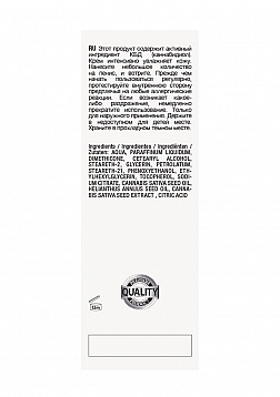 | Dimensions package | 12,50 x 4 x 4 cm | | Weight package | 75 gram | | Product dimensions | 10,5 x 5,5 x 3,3 cm | | Product weight | 73 gram | | Product volume | 50 ml | | Ingredients | Aqua, Paraffinum Liquidum, Dimethicone, Cetearyl Alcohol, Steareth-2, Glycerin, Petrolatum, Steareth-21, Phenoxyethanol, Ethylhexylglycerin, Tocopherol, Sodium Citrate, Cannabis Sativa Seed Oil, Helianthus Annuus Seed Oil, Cannabis Sativa Seed Extract , Citric Acid |