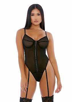 "Nightly Hook Up" teddy features sheer mesh paired with hook and eye closure along the center, unlined underwire cups and attached garter straps. This product comes in a box.