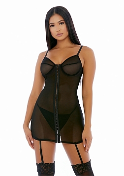"Hook Me Up" two-piece chemise lingerie set features sheer mesh paired with hook and eye closure along the center, unlines underwire cups, adjustable straps, attached garter straps and panty. This product comes in a box.