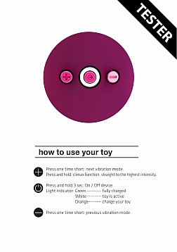 | Dimensions package | 10,50 x 5,50 x 3,20 cm | | Weight package | 110 gram | | Product dimensions | 10,5 x 5,5 x 3,2 cm | | Product weight | 60 gram | | Quantity motors | 1 | | Rotations per minute | 11000 RPM | | Speed modes | 10 | | Noise level | 55 dB | | Rechargeable | Yes | | Rechargeable time | 90 min | | Recharged battery lifetime | 75 min | | Waterproof | Yes | | Phthalate free | Yes | | Materials | Silicone, ABS |