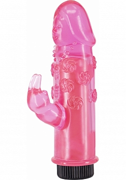Compact vibes with this vibrator, it has a shaft with glans shaped top and clitoral rabbit stimulator. One perfect speed with the flip off a switch!