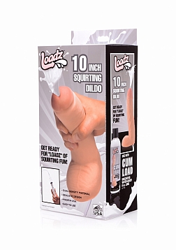 This 10 incher will fill you to the brim. Get ready for Loadz of squirting fun! This ultra lifelike dildo features a dual - density material that looks and feels just like the real thing. Enjoy every vein, wrinkle, and ridge of this ejaculating dong as you enjoy penetration on your own or with a partner. To use, just fill the syringe with Cum Load Unscented Water - based Lube or another fluid, insert the tip of the syringe into the hose, and when you are ready for a wet rush, push in the plunger! This material is compatible with both silicone and water - based lubes and can be cleaned with mild soap and warm water after use.