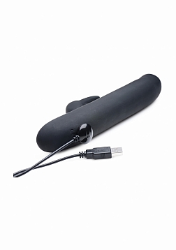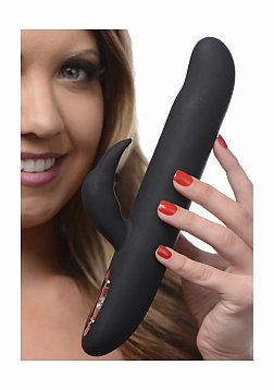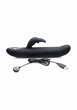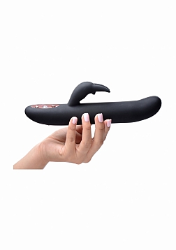 Experience a blended orgasm from the blissfully buzzing bunny against your clitoris and the smooth-as-silk shaft that simulates a Come-Hither motion against your sweet spot. This premium silicone vibrator features 3 speeds of thrumming and 7 patterns of throbbing, as well as an ample shaft that flexes up and down to stroke your G-spot with 3 speeds of its own. The elegant gem-adorned control panel is simple to use. A protruding bunny nose will pinpoint your clit for vibration, while the ears will flutter around it for an entirely different sensation. This pleasure tool is magnetically rechargeable and waterproof so that you can treat yourself in the bath or shower. The phthalate-free material is non-porous for an easy clean with mild soap or toy cleaner. Avoid use with silicone lubricants.