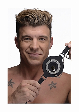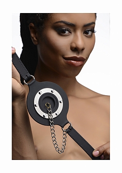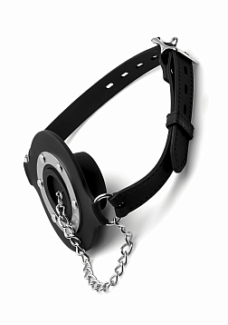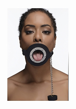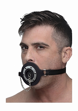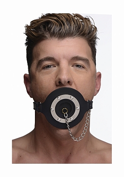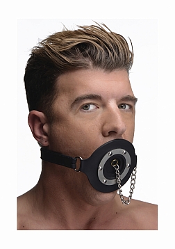 Plug up their pie hole with this unique silicone gag. Push the ring past their teeth and secure the soft straps at the nape of their neck. The buckle can accommodate a lock, not included, to ensure that there is no hope for escape. Keep your plaything plugged up so that all you can hear are muffled moans and garbled groans. Or remove the plug to savor every whimper and gasp. The plug is connected by a chain so that you never lose it. The opening is 1.5 inches to accommodate the possibility of forced penetration. The premium silicone material is non-porous and phthalate-free, and cleans easily and thoroughly with mild soap or toy cleaner. All hardware is nickel-free.