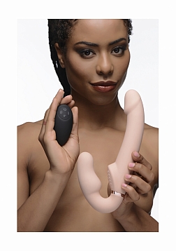 Perfect for penetrating a male or female body, this remote-controlled strapless strap-on features extreme vibration and an inflatable vaginal bulb to create the perfect fit for your body. The shape allows one partner to insert the smaller end vaginally, holding it with their kegel muscles or adding a harness for extra support. However, this unique model of strapless strap-on also has an inflating bulb to lock in place, as well as apply greater pressure inside.