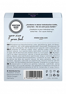 In addition, condoms currently available in the market vary considerably in texture, flavour and shape. But they hardly fluctuate in size. Condom size isn't really mentioned perhaps because the width varies between 52 56 mm. Only a very few condoms are available in size 57 mm, a condom size that is already considered very big. However, if we look at recent studies on erect penis size, widths of 58 - 61mm were actually found to be the average sizes. MISTER SIZE -7 condom sizes for a perfect fit! Offering greater comfort, safety and feeling!