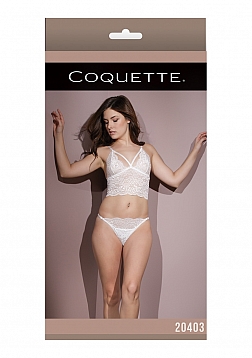 Longline bralette with sexy crotchless panty. The scallop lace fabric is stretchy. The cups on the bralette have strappy details and the panty has adjustable straps on the size, this makes it possible to adjust the size.