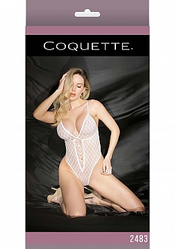 High cut teddy with diamond mesh and lace-up detail at the front. The straps are adjustable.