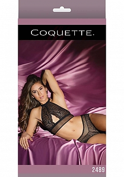 Fishnet and lace halter top with key-hole accent and matching panty with lace-up at the back. This is made of stretchy fishnet and scallop lace.