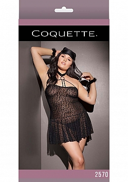 Kitty halter babydoll with strappy Halter neck in black-on-black leopard print. Including fur trim cuffs for ankles or wrists and a kitty eyemask.