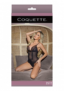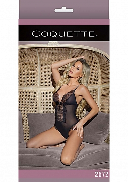 Crotchless teddy with eyelash lace along the cups and hips. The top has fake buttons and a bow. The soft mesh material is stretchy and the shoulder straps are adjustable.