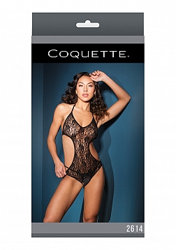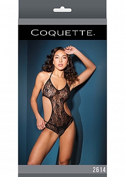 Lace halter teddy, crotchless and backless. Made of stretchy lace.