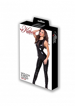 A classic catsuit with a sensuous twist. Curve skimming Wetlook and sheer mesh panels make for an unforgettable look. With full Wetlook back and back zipper opening.