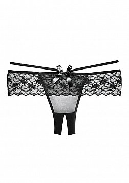 Crotchless sheer panty with a rhapsody of floating scalloped lace topped with dainty bands.