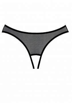 Hidden desires revealed in this seemingly secretive sheer mesh crotchless panty, with eyelash lace caressing the ouverte derriere. That it is topped with a bow is a wink of sweet, sprinkled over a flow of naughty.