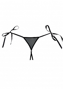 Teasing skinny ribbons decorate the hips, waiting to be undone. Scalloped lace outlines a provocative ouverte front, while the Brazilian back is topped with a triangle of sheer mesh.