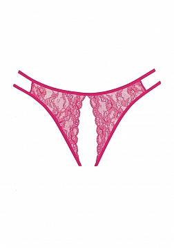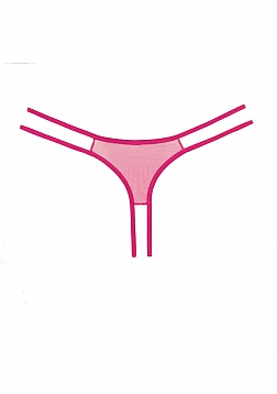 Seductively sweet, scalloped lace sweeps tantalizingly across the front leaving a peekaboo opening. Double skinny straps graze the hips with a very cheeky cut of sheer mesh in the back.