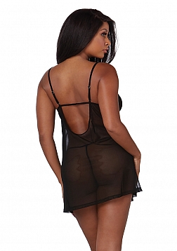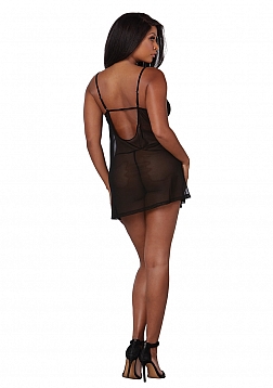 Stretch mesh chemise and robe set. Scalloped lace trim throughout. Adjustable straps. U-back with back hook closure.