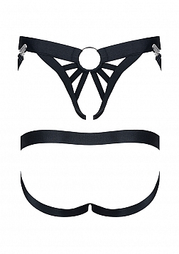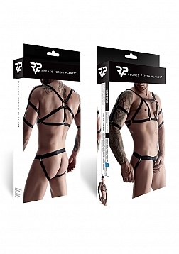 Bondage rubber t-shirt and men's rubber briefs with decorative element in the front and flexible clasp.