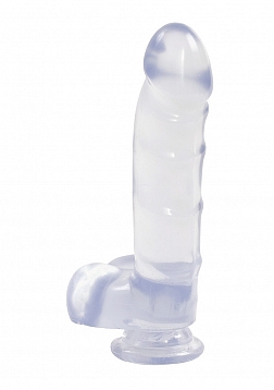 Satisfy your hunger for pleasure with this amazing 6" Jelly Jewels with Suction Cup Cock and Balls! Its realistic head and balls will feel amazing while the ridged shaft will send you over the top! It also has a built in suction cup at the base, allowing it to stick on flat surfaces for hands-free action. Available in Ruby, Sapphire, and Diamond.