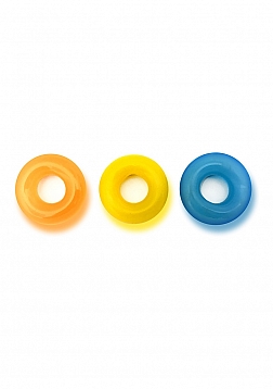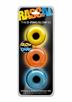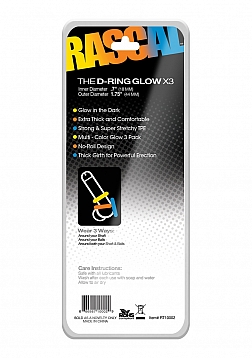 Rascal Toys D-Ring Glow in the Dark Cock Rings X3. Glow 3 pack of Donut Rings are extra thick for comfort. Made from strong and super stretchy Thermoplastic Elastomers TPE. No roll design. Inner diameter 0.7 inch, outer diameter 1.75 inches. 3 ways to wear. Around the shaft. Around the balls. Around the shaft and balls. Care instructions: this product is safe with all lubricants. Wash thoroughly with mild soap and warm water or toy cleaner. Pat dry and allow product to completely air dry. Store separately.