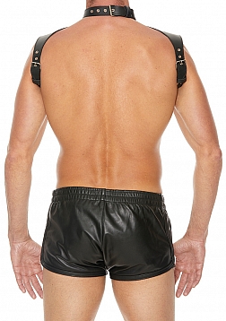This harness is crafted with thick black leather shoulders that command attention and speak to all things strong and masculine, while the attached collar with metal buckle fastening makes play easy. The leather and steel detailed harness has 7 adjustable straps; 2 across the chest, 4 around the shoulders and 1 around the neck. The harness is highly adjustable, allowing you to find the perfect fit. The chest strap also has an O-ring on the front for easy leash or lead attachment. Wear it on your bare skin or over your clothes for a look that promises effortless attention.