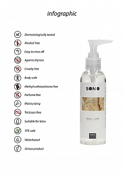 SONO Anal Lube is a water-based lubricant for anal use. Suitable for use with latex condoms. Dermatologically tested, fat-free, colourless, odourless and tasteless. Directions for use: Apply as much gel as you want on the body part that you want and repeat as often as you like. Keep out of reach of little children. Store in a cool, dark place.