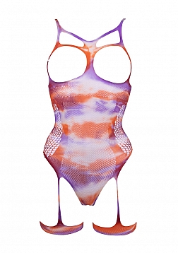 Open-cup, Tie Dye Fishnet Teddy with strappy neckline and open crotch. The teddy has attached suspenders/garters. Pair it with some denim shorts for a cool party outfit.This bodystocking fits sizes S-XL. Pair it with the added 'Dazzling Bling Stickers' for an extra fabulous look.