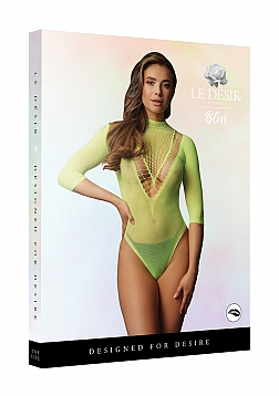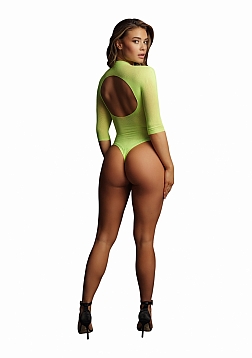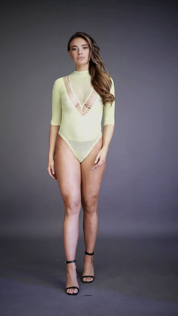 Round neck fishnet body with contrast V-neckline. The body has short sleeves and a keyhole at the back. This bodys fits size S-XL. Thong not included. Thong not included.