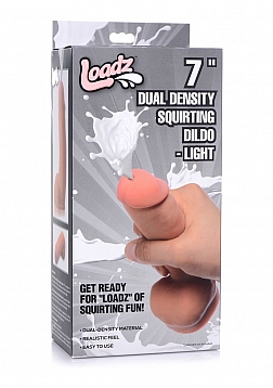 Enjoy a luscious dual density dildo and put on a show for your lover or your fans with this meaty, satisfying, squirting dong! Ejaculation lovers will enjoy the simple squeeze-and-squirt design - use on your lover and cover them with your liquid of choice. Perfect for use with a realistic cum lube, this Dual Density dildo is crafted for the cum hungry!