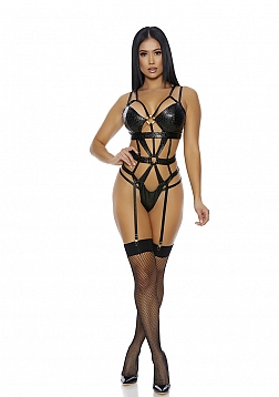 1pc. Teddy features matte faux leather embossed cheetah print with gold O-ring hardware and strappy design and attached garter straps.