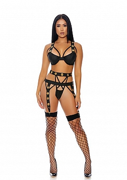 3pc. Lingerie set features strappy grommet details bra paired with a matching high-waisted cutout panty and garter belt.