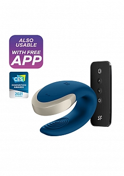 Double Love, our luxury couples vibrator, features thrilling soft silicone combined with high-quality precious metal. Doubly paired with a convenient wireless remote and our high-tech App, long distance play is possible and the options endless! Enjoy a breath of fresh air while making love with the Satisfyer Double Love! The couples vibrator with 2 motors will impress you with its classic U-shape, which stimulates both partners with powerful vibes. The slightly curved shaft is inserted vaginally and simultaneously stimulates the G-spot as well as the penis, while the upper part titillates the clitoris. The body-friendly silicone also seduces you with its smooth feel. The Satisfyer Double Love also has a lot to offer optically: The sophisticated details made of high-quality, real metal lend your lovemaking a touch of luxury. The Satisfyer Double Love can be controlled with the included wireless remote control as well as with the free Satisfyer Connect App. You can discover new facets of your love life together using the app: In addition to controlling your device remotely, you can also create your own vibration programs or have audio and video chats. What are you waiting for? The couples vibrator is waterproof (IPX7) so it can also enrich your love life in the shower or bathtub with its hot vibrations. If your couples vibrator ever runs out of steam, you can recharge the integrated batteries with the included USB charging cable.
