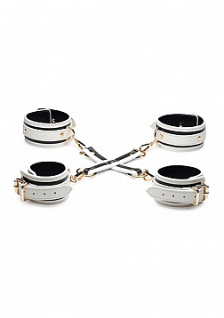 Add a kinky glow to your bedroom bondage fun! This Glowing Hog Tie Set makes it easy to tie your lovers limbs behind their back so you can enjoy their body to your hearts content. The white PU Leather and golden metal hardware add an elegant touch!