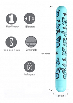 Float like a butterfly and lift your orgasms with silky soft wings with the Maia Novelties Monarch. This 10-Function Rechargeable Bullet Vibrator is coated with silky soft Silicone that is 100% body safe. The Butterfly print design belies a soft yet powerful motor. The long, slender design allows for easy handling and multiple uses while the end position control button allows for easy speed change.