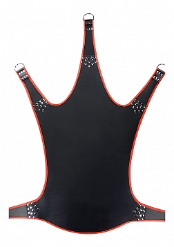 Black leather sling with elegant is made with red trim for a very hot style. It is designed with 5 attachment points. Dimensions 113 x 122cm. Fine and durable genuine leather material. High quality. Vegetable tanned. Made in Europe.