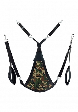 This Camo fabric sling is designed with a Triangle shape and Camouflage fabric. It fits with 3 or 4 attachment points. It comes with the accessories: the 4 hangers with the metal carabiners / the padded foot supports (11cm wide) / the black triangle cushion (24 x 20cm) Material: polyester made in Europe