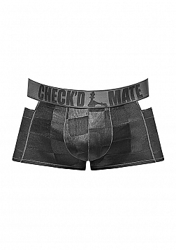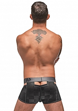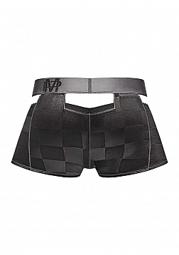 From the Check'd Mate collection by Male Power, this style includes: A short with a sheer tone on tone checker board pattern featuring attention-grabbing cutout windows on the hips and in the back, tone on tone decorative stitching with a plush elastic trim, and playful characters that adorn the plush elastic waistband.