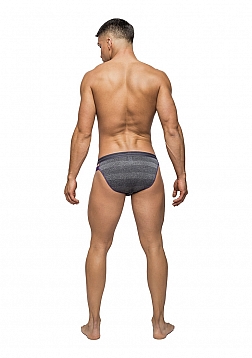 From the Heather Haze collection by Male Power, this style includes: A cutout bikini with a comfort pouch and plush bright elastic bands on the hips to create a cutout window effect featuring bright decorative stitching, a sporty plush elastic branded waistband, and full rear coverage.
