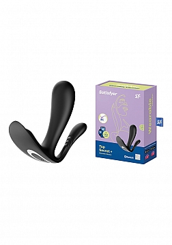 The Secret you won't want to keepÂ… The Top Secret+ wearable vibrator features a flat, ergonomic base, allowing for maximum comfort, as well as a ridged shaft for clitoral stimulation. With a bonus shaft for anal stimulation, this vibe is ergonomically curved to perfectly hit the G-spot as well. Experience strong vibrations throughout due to the drop-like shape. Bluetooth enabled, the Top Secret+ connects to the award-winning, free, Satisfyer Connect app, giving you the option to independently control the two motors and customize the Air-Pulse pressure waves and vibrations while on the go. The Top Secret+ is made of body safe silicone, is rechargeable, and is IPX7 Waterproof rated.