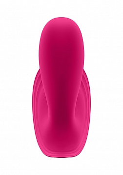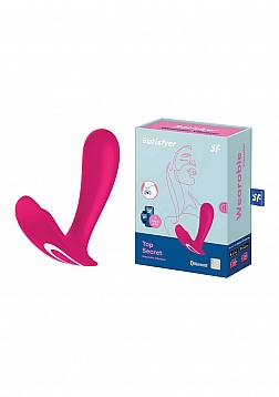 CONFIDENTIAL! TOP SECRET INFORMATION FOLLOWS: The Top Secret wearable vibrator features a flat, ergonomic base, allowing for maximum comfort, as well as a ridged shaft for clitoral stimulation. Ergonomically curved to perfectly hit the G-spot, experience strong vibrations throughout due to the drop-like shape! Bluetooth enabled, the Top Secret connects to the award-winning, free, Satisfyer Connect app, giving you the option to take control of your pleasure and start your journey while on the go. The Top Secret is made of body safe silicone, is rechargeable, and is IPX7 Waterproof rated. Can you keep the secret?