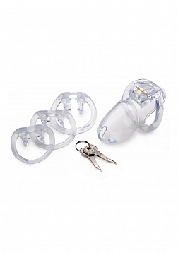 Confine your sub in this clear chastity prison! The Clear Captor locks your partners sexuality in clear view, preventing them from pleasuring themselves until you set them free. Made with forgiving materials for long term comfort, as well as a generous amount of ventilation holes and a pee through tip. The Clear Captor includes 4 ball rings of graduating size to fit all kinds of ball sacks! Whether your partner is high and tight or loose and large, choose from the smallest 1.7 inch ring to the largest 2.2 inches to lock their balls until further notice. The durable ABS plastic used for the Clear Captor is smooth and forgiving, perfect for all day chastity play. The cage itself features plenty of ventilation and a cum-thru tip for the necessaries, but remains rigid and firm for a sense of security and confidence for the wearer. The secure locking mechanism secures this cage without pesky locks getting in the way! The Clear Captor includes two keys, one for you and the other for your sub in case of emergencies.