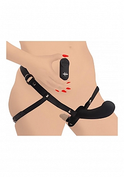 Enjoy penetrating your partner and being penetrated at the same time! With this pegging harness, you can enjoy the feeling of being filled as you give that sensation to your partner, as well. As a bonus, you can both enjoy 4 speeds and 7 patterns of vibration. Control it hands-free with the remote control that controls each dildo. The dildos are detachable from the PU leather harness and made of premium grade, phthalate-free silicone that is body-safe for worry-free fun! The small dildo is curved for G-spot stimulation that presses against your sweet spot as you thrust. Make sure to only use water-based lubricant for best results. The harness can be adjusted around your waist and thighs for a comfortable fit. After use, recharge the vibrating dildos with a USB charger and hand wash the silicone with warm water and antibacterial soap and a toy cleaner. Dry with a soft cloth and store in a cool, dark place out of direct sunlight and separate from other toys. Remote control requires 1xCR2032 battery (included). Measurements: LARGE DILDO insertable length: 6.25 inches, widest insertable width: 2 inches SMALL DILDO insertable length: 3.3 inches, widest insertable width: 1.4 inches Harness adjusts up to 48 inches waist circumference Thigh straps adjust from 13 inches to 26 inches in length