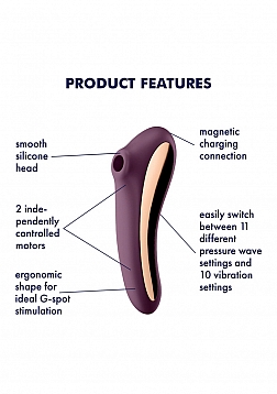 Get ready to kiss your old lover goodbye and say hello to the Dual Kiss! Offering both internal sensations and our award-winning Air-Pulse technology, the Satisfyer Dual Kiss is ideal for those seeking a 2-in-1 solution. With a slightly curved shaft, experience targeted g-spot arousal with your new Dual Kiss. On the other end of this versatile lover, find precise Air-Pulse pressure waves, sure to send you into pure bliss. The Dual Kiss comes equipped with two, independently controllable, motors with 10 vibration programs and 11 pressure wave intensities. Made of body safe silicone, the Dual Kiss is rechargeable. It is IPX7 Waterproof rated and ready for a deep dive! Experience new feats of pleasure with your all-new Dual Kiss.