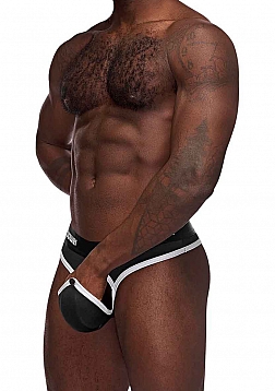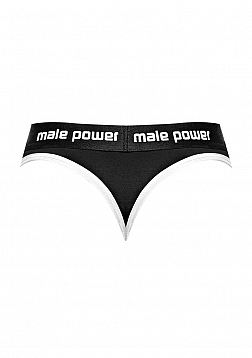 From the Helmet collection by Male Power, this style includes: A thong featuring a padded pouch with a functional top snap that covers a circle cutout for easy access, and a branded satin finished waistband.